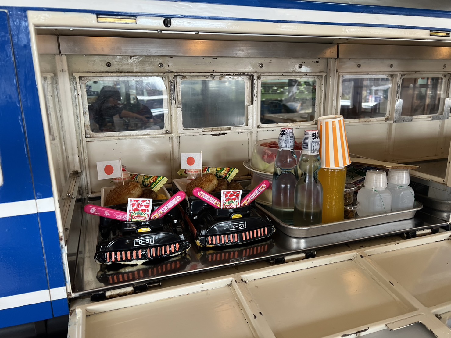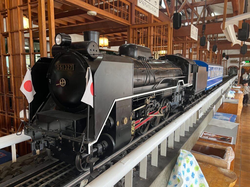 それぞれのテーブルには駅名がついてあり、実物の1/5サイズのD51蒸気機関車が停車駅をアナウンスして、料理を運んでくれます。